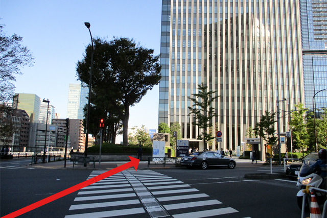 (2)歩道をまっすぐ50メートル程進み、交差点手前の横断歩道を右に渡ります。