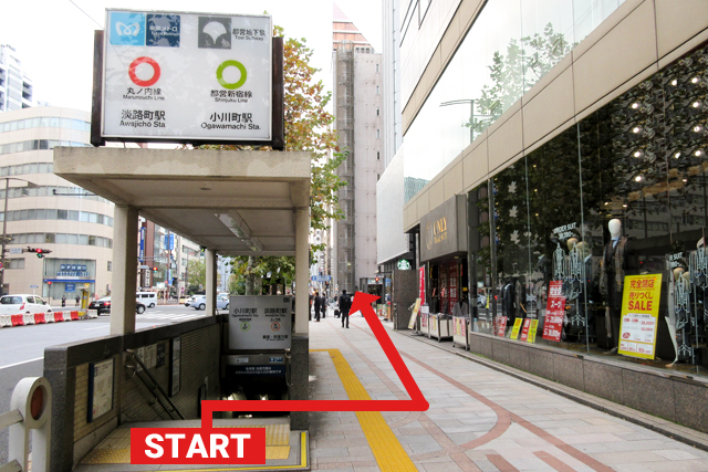 (1)A3出口をご利用の場合は、階段を上がりUターンし、淡路町交差点に向かって進んでください。