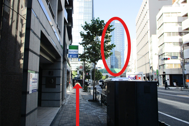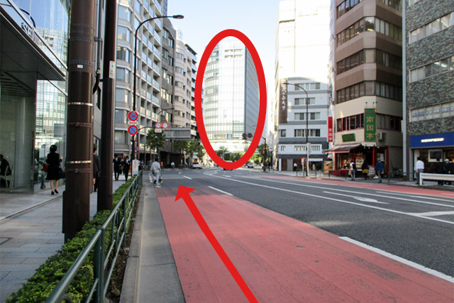 (3)外堀通りの先にワテラスアネックスの建物が見えます。