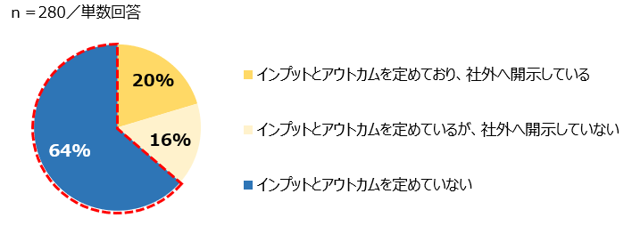 三つ目は「人材戦略の実現に向けたインプット(人的資本投資)とアウトカム(達成すべき目標)の設定と社外開示」です。「インプットとアウトカムを定めていない」とする企業の割合は64%と6割以上に上っています。本項目は有価証券報告書における人的資本開示の対象となっていることから、上場企業は対応を急ピッチで進める必要があるといえます。