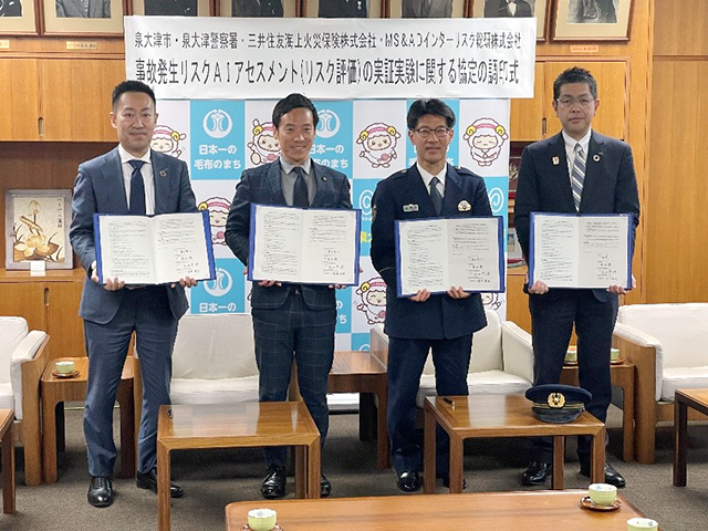 泉大津市(市長:南出 賢一)、泉大津警察署(署長:森田 徹)、MS&ADインシュアランス グループの三井住友海上火災保険株式会社(本社:東京都千代田区、社長:舩曵 真一郎、以下「三井住友海上」)、MS&ADインターリスク総研株式会社(本社:東京都千代田区、社長:一本木 真史、以下「インタ総研」)は「事故発生リスクAIアセスメント(リスク評価)」(注)の実証実験に関する協定を締結しました。